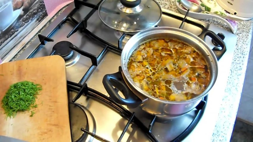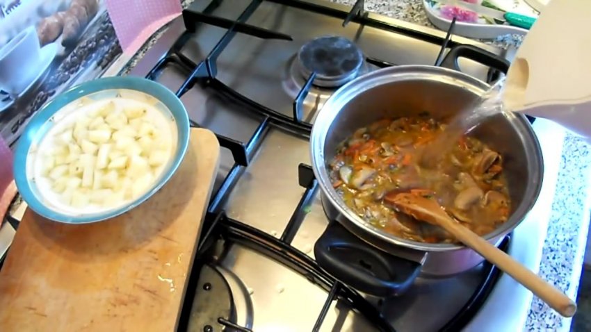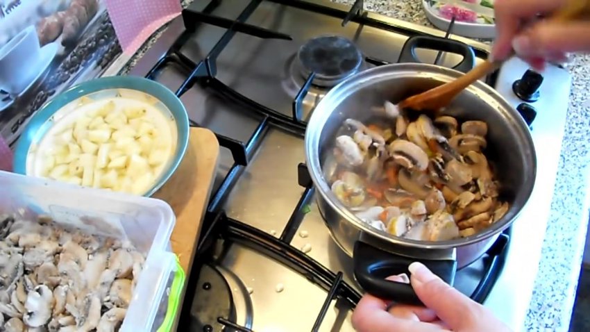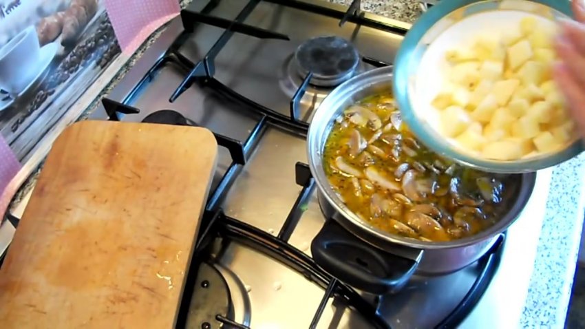 - Всипати в каструлю з бульйоном гриби, варити на слабкому вогні 20 хвилин.
