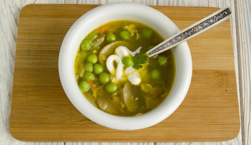 - У міру готовності грибів всипати в супчик зелений горошок і проварити 2-3 хв.