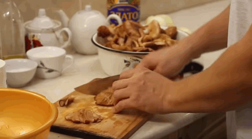 Добре промиті й обсушені від зайвої вологи гриби порізати на довільні шматки (якщо опеньки маленькі, їх можна готувати цілими).![]()