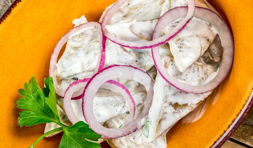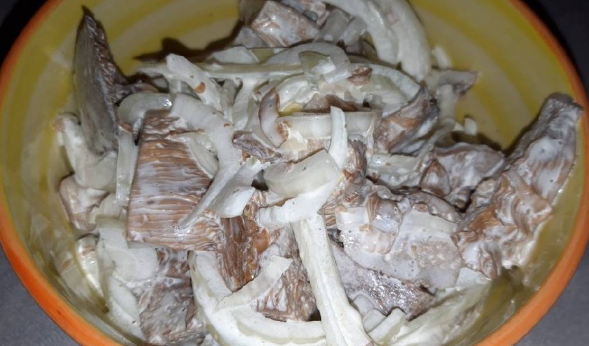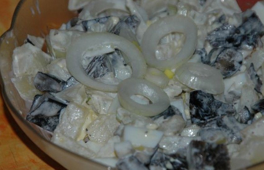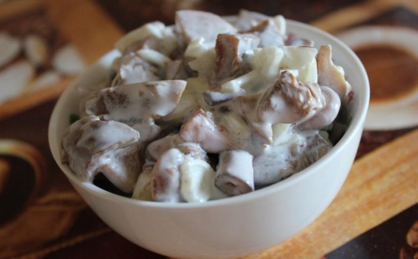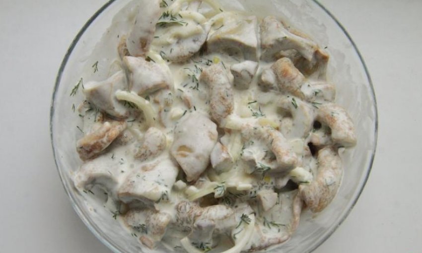 - Закуска із солоних чорних груздів із цибулею та сметаною