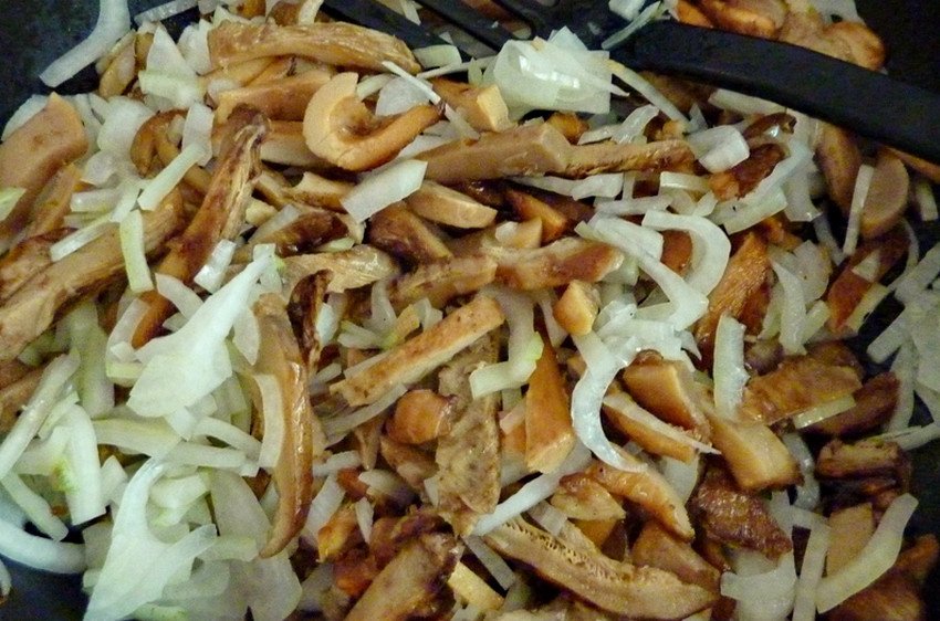 - У сковорідці розігріти олію, висипати грибну нарізку і цибулю, нашатковану півкільцями.