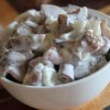 - Відварити картоплю в мундирі, очистити й нарізати дрібними кубиками.