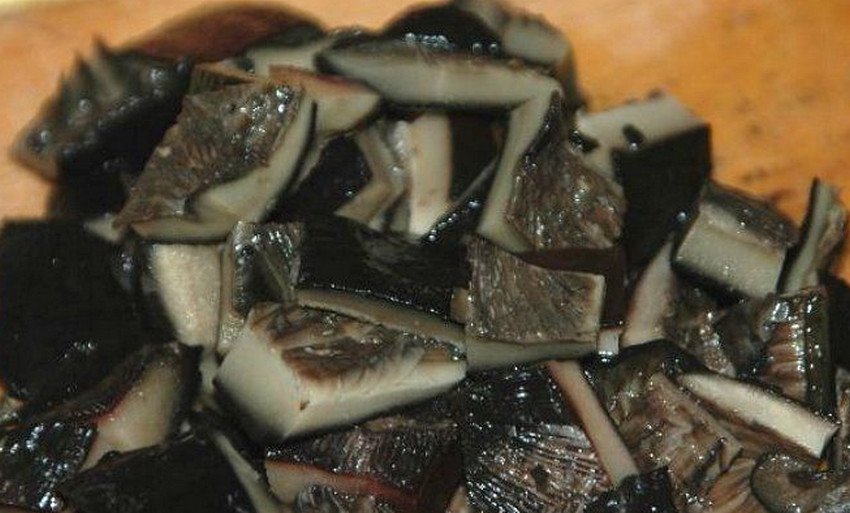 - Ретельно промиті й очищені гриби нарізати великими часточками, відварити і відкинути на друшляк.