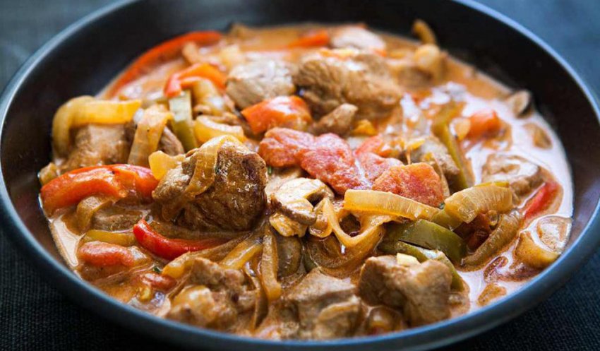 - З'єднати овочево-грибну суміш зі свининою і томити всі інгредієнти 15 хвилин.