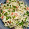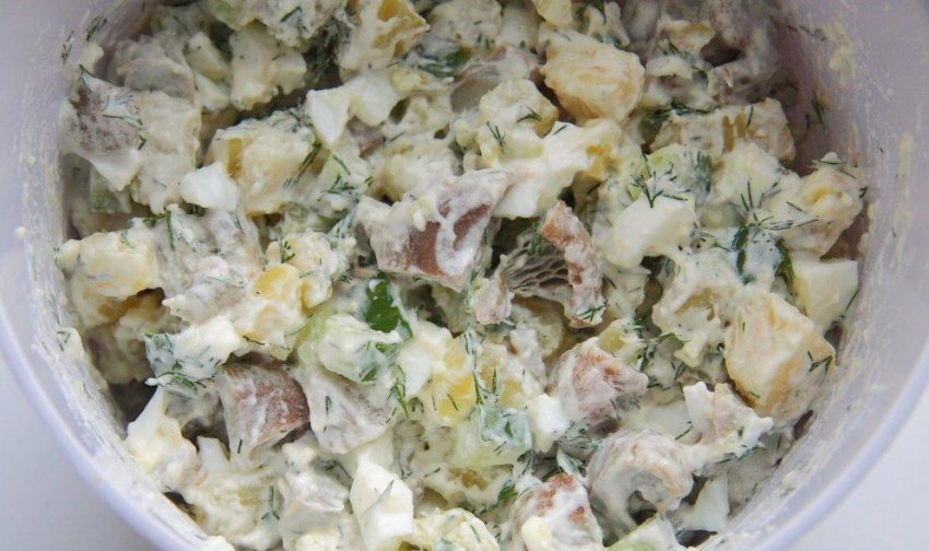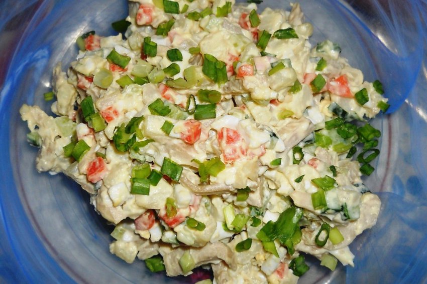 - Змішати всі інгредієнти в глибокому посуді, залити сметаною, додати цукор і дрібно нарізану зелень.