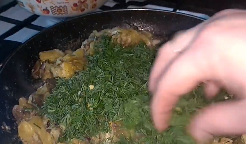 гриби та смажити їх, поки не відчуєте грибний аромат. Висипати в сковорідку нарізану картоплю, влити води і, перемішуючи, обсмажити до рум'яності.![]()