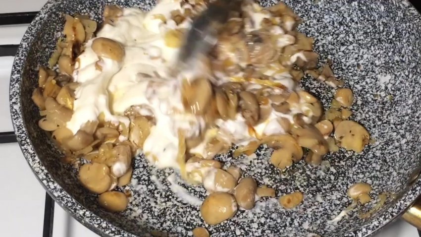 До обсмажених інгредієнтів слід додати сметану і тушкувати 5 хвилин до часткового випаровування рідини.![]()
