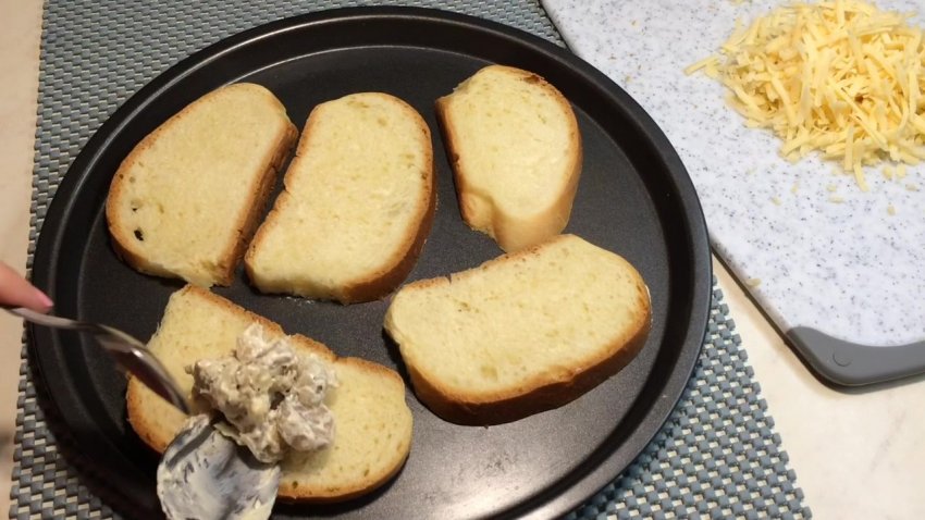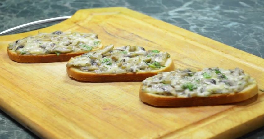 Батон нарізати пластинами, поверх якого нанести грибну масу.![]()