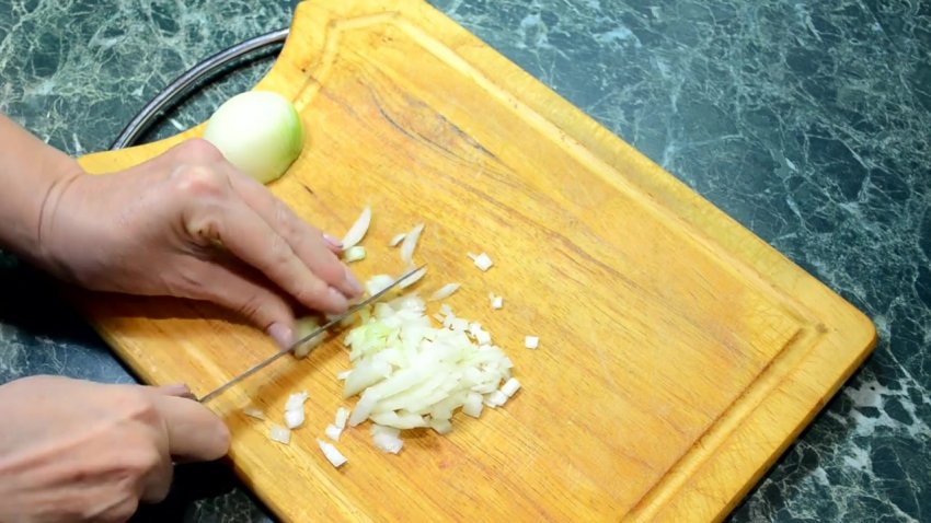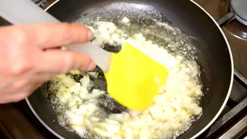 Нарізати ріпчасту цибулю півкільцями і перекласти на розігріту сковороду з рослинною олією. Цибулю необхідно обсмажити до золотистого кольору протягом 2-3 хвилин на середньому вогні.![]()