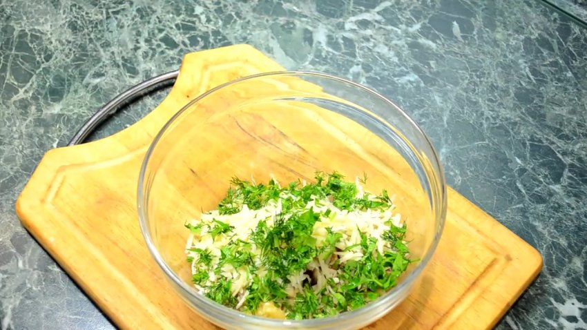 Обсмажені печериці з цибулею необхідно перекласти в миску і змішати із зеленню, часником і сиром. Отриману масу потрібно заправити майонезом і добре перемішати.![]()