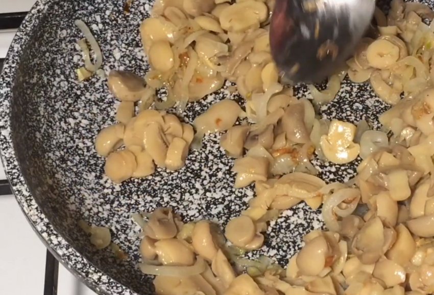 Нарізані пластинками консервовані гриби необхідно всипати на сковороду до цибулі з додаванням спецій. Обсмажувати гриби необхідно близько 10 хвилин, поки не википить уся рідина.![]()