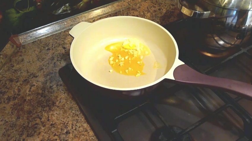 прогріти 20 г вершкового масла та 0,5 ст. л. маслинової олії на пательні, додати часникову нарізку - потримати приблизно хвилину, але не більше, оскільки надто смажений часник видає неприємний запах, що зіпсує смак страви.![]()