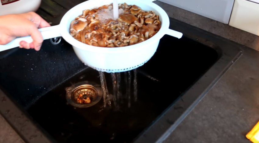 Злити воду за допомогою друшляка. Гриби обполоснути під струменем холодної води.![]()