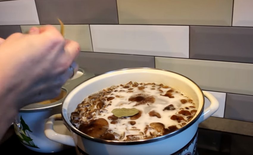 - У доведений до кипіння маринад викласти відварені гриби. Перемішати та закип'ятити.