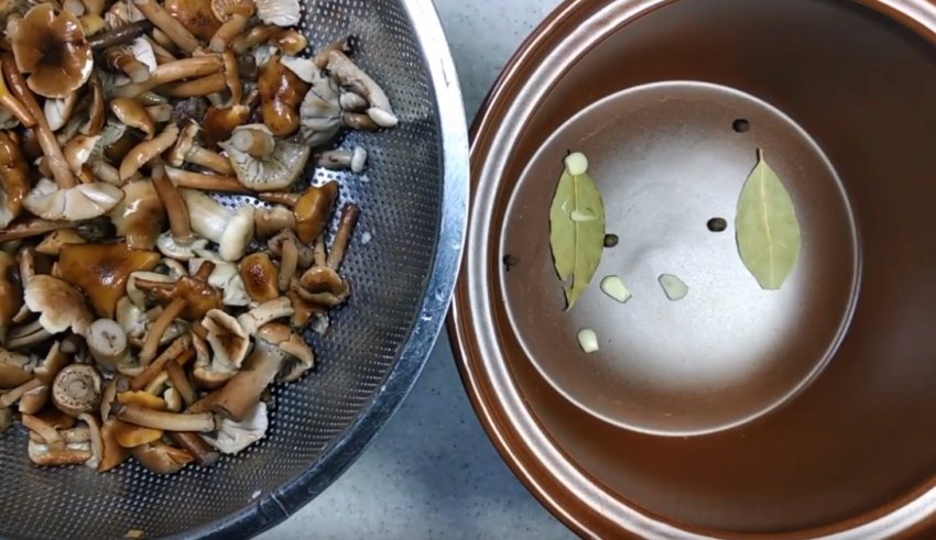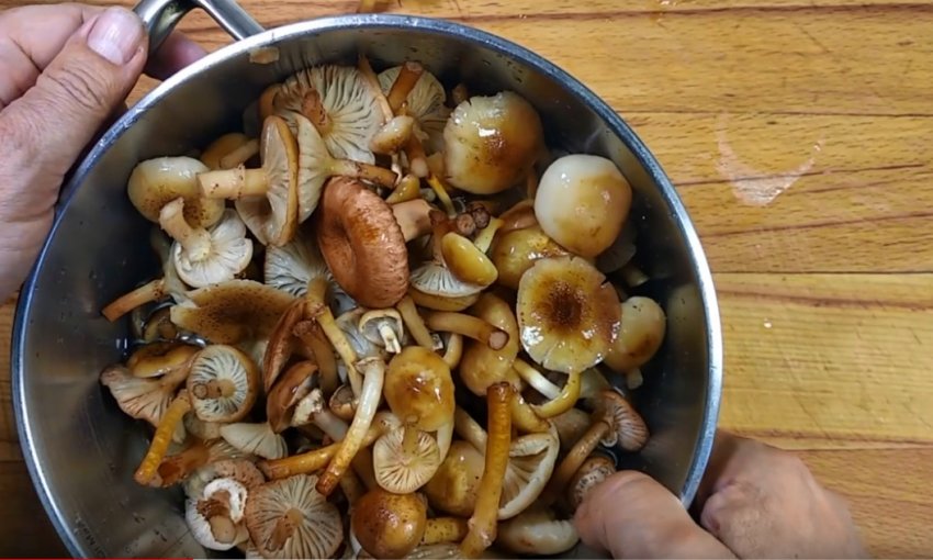 - Очищені та промиті гриби відварити в підсоленій воді, потім продовжувати варити ще 5-7 хв, час від часу знімаючи пінку. Проварені опеньки мають осідати на дні каструлі, процідити за допомогою друшляка і залишити стікати.