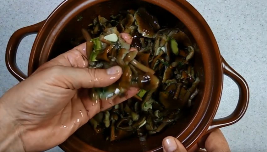 У керамічну ємність викласти шар із невеликої кількості спецій (подрібнений часник, сіль, лаврове листя, горошини перцю, гвоздику, подрібнений кріп).Далі чергувати шар спецій і грибів. Заключним має бути шар спецій. Зверху присипати сіллю.![]()