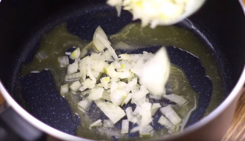 Взяти каструлю, злегка нагріти на конфорці, влити олію, додати туди ж невеликий шматочок вершкового масла, змішати і прогріти. кинути туди цибулю і обсмажувати до золотистого напівпрозорого кольору.![]()