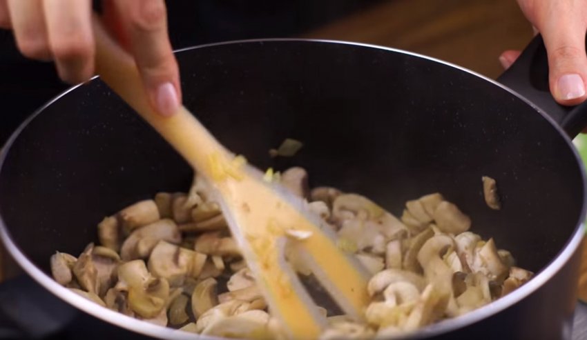 Потім додати гриби, помішувати і смажити на середньому вогні протягом 5-7 хвилин.![]()