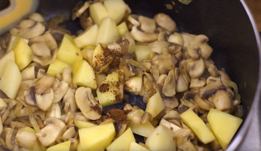 Саме час додати картоплю, посолити, висипати половину чайної ложки мускатного горіха. Перемішати всі інгредієнти в каструлі. Залити все гарячою водою так, щоб її рівень не перевищував овочі. Варити на слабкому вогні під кришкою 20 хвилин.![]()