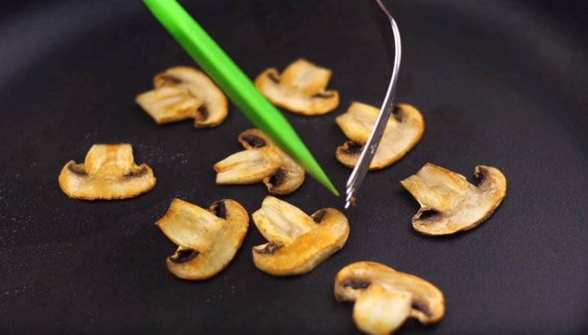 У цей час нагріти сковорідку і, не додаючи олії, обсмажити з двох боків до золотистого кольору ті кілька шматочків, які ви залишили раніше для прикраси.![]()