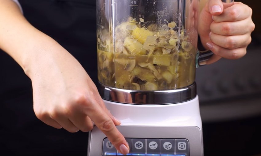 Гриби та картопля готові. Далі необхідно збити все за допомогою блендера до однорідної маси. висипати весь вміст каструлі в чашу блендера, щільно закрити її кришкою і ввімкнути комбайн. збивати до однорідної структури, що нагадує за консистенцією крем.![]()