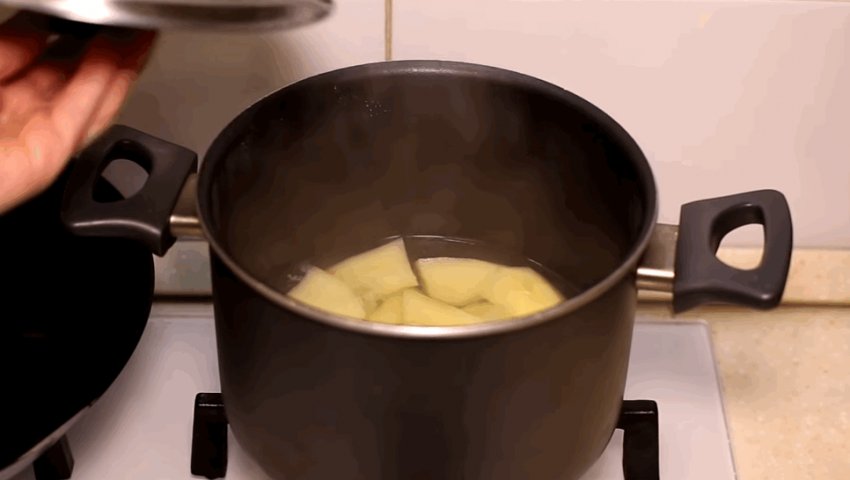 - Почищену картоплю нарізати середніми кубиками, зварити, злити воду і розім'яти.
