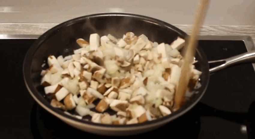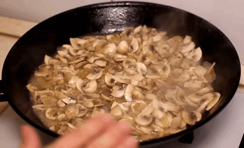 Всипати гриби і продовжувати тушкувати, поки вода частково не випарується. Отриману масу відставити в сторону до охолодження.![]()