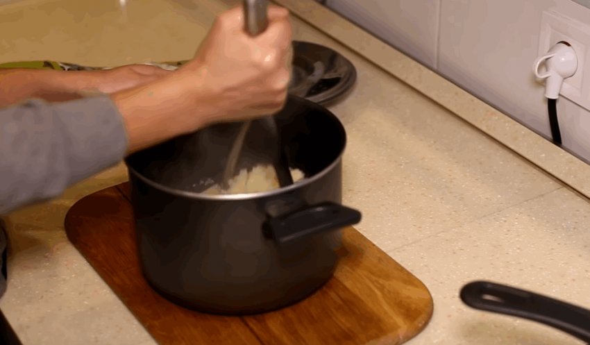 З картоплі злити воду, розім'яти товкачем і залишити остигати.![]()