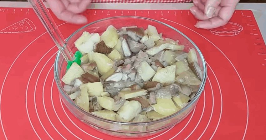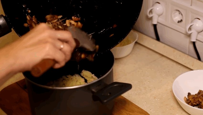 2/3 грибної маси відправити до картоплі та перемішати.![]()