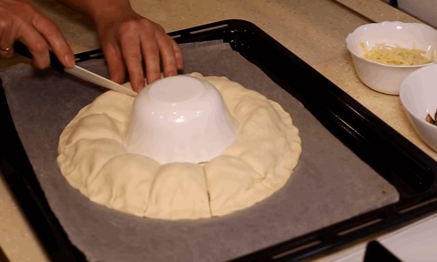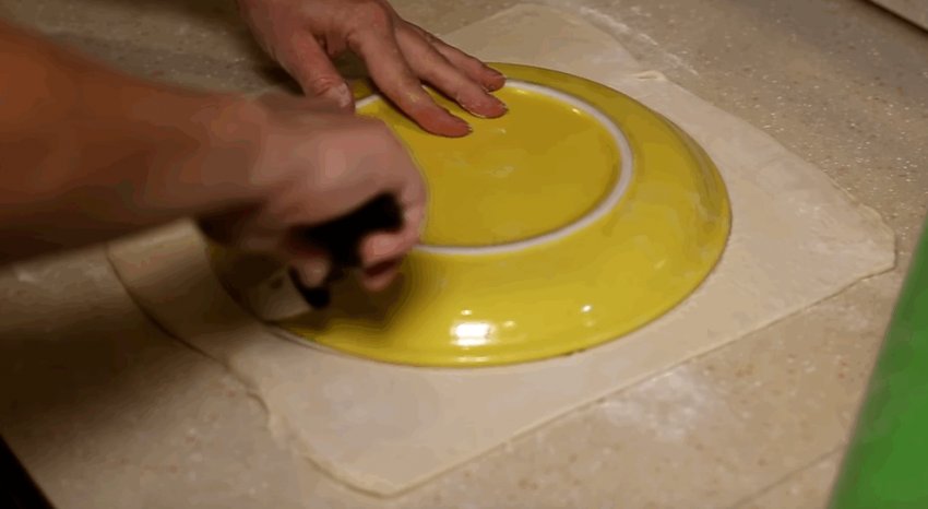 Листкове тісто розкачати і вирізати коло великого діаметру, для чого можна використовувати тарілку.![]()