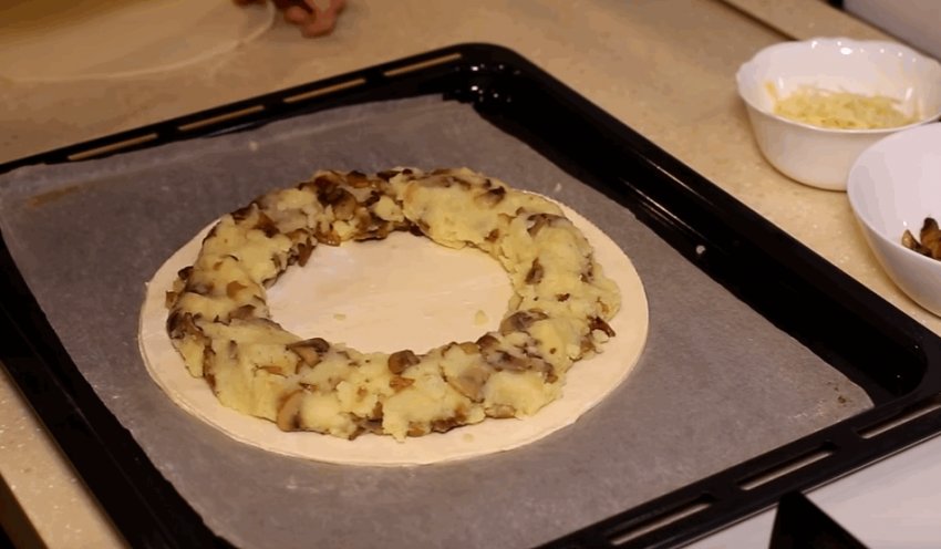 На пергамент помістити отриманий перший корж і начинку, роблячи вільний зазор від краю тіста (близько 2 см) і залишаючи вільною його середину, тобто виходить своєрідний "бублик".![]()