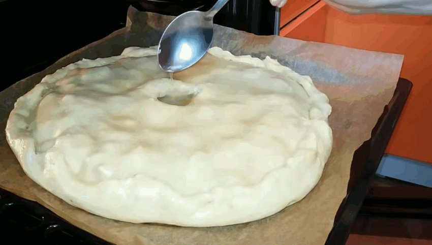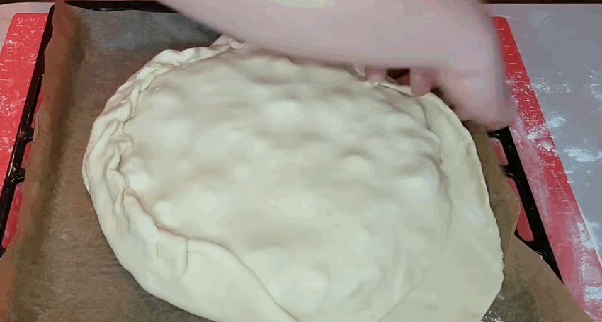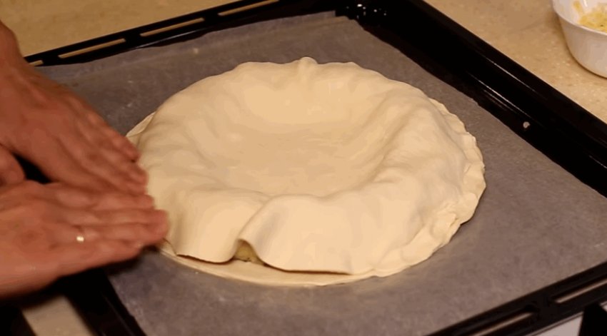 Накрити пиріг другим коржем більшого діаметру, центральну частину прим'яти, щоб шари тіста стикнулися між собою. Край добре затиснути.![]()