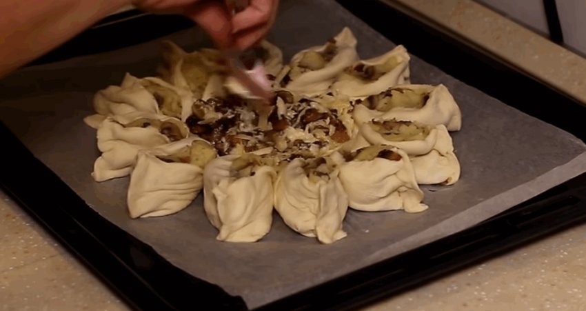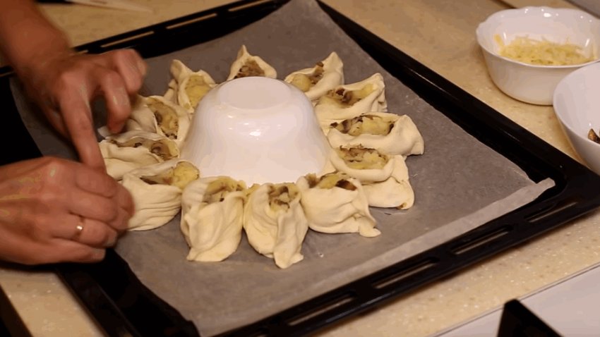 У решту грибочків всипати натертий твердий сир і майонез, все перемішати і викласти в середню частину пирога, щоб він набув вигляду квітки.![]()