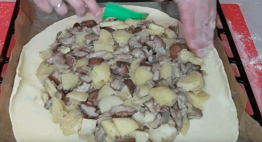 Для пирога з грибами та картоплею слід вибрати молоді гриби без ознак пошкоджень черв'яками або іншими шкідниками. Картопля також має бути якісною, не млявою. Гливи і печериці не потребують попередньої обробки, а решту грибів для позбавлення від гіркоти 20 хвилин проварюють у солоній воді.