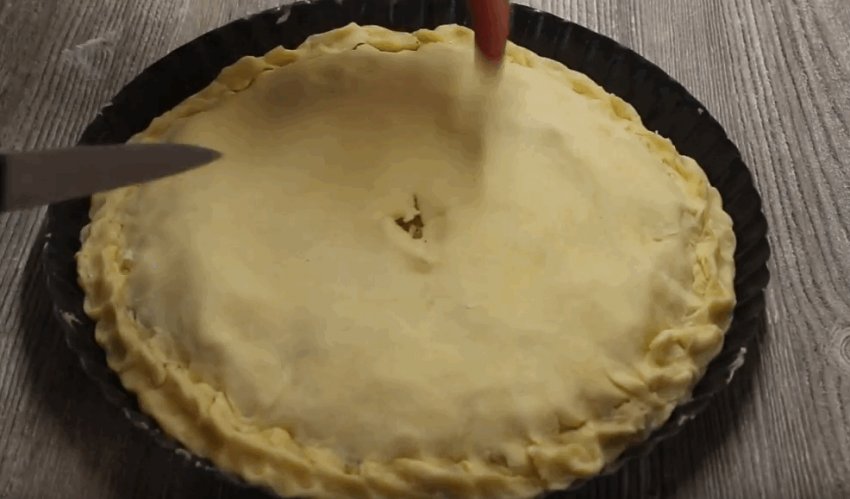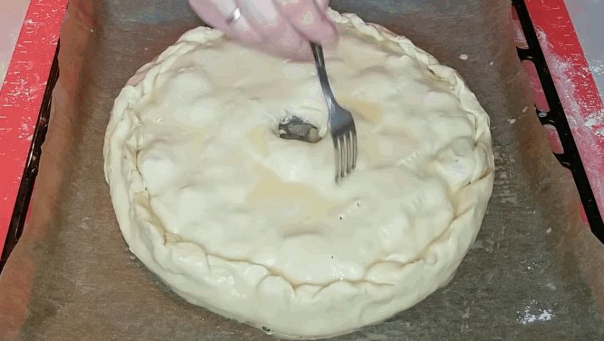 Закрити начинку другим листом тіста, краї коржів добре заліпити. У верхньому коржі залишити невеликий отвір для пари.![]()