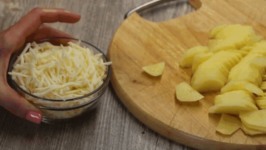 Очищену картоплю тоненько нарізати півкільцями, сир крупно натерти.![]()