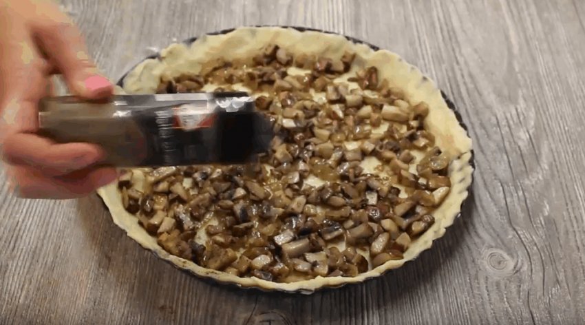 Перенести один корж у форму, висипати грибочки, посолити і поперчити.![]()