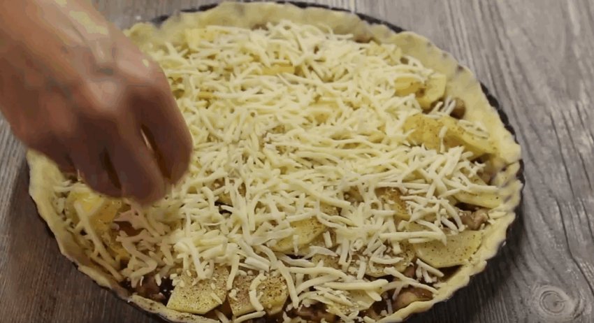 - Проварену картоплю нашаткувати тонкими пластинками, рівномірно розкласти на коржі, змастити сметаною, у міру посолити й поперчити. Далі викласти суміш грибів і цибулі.