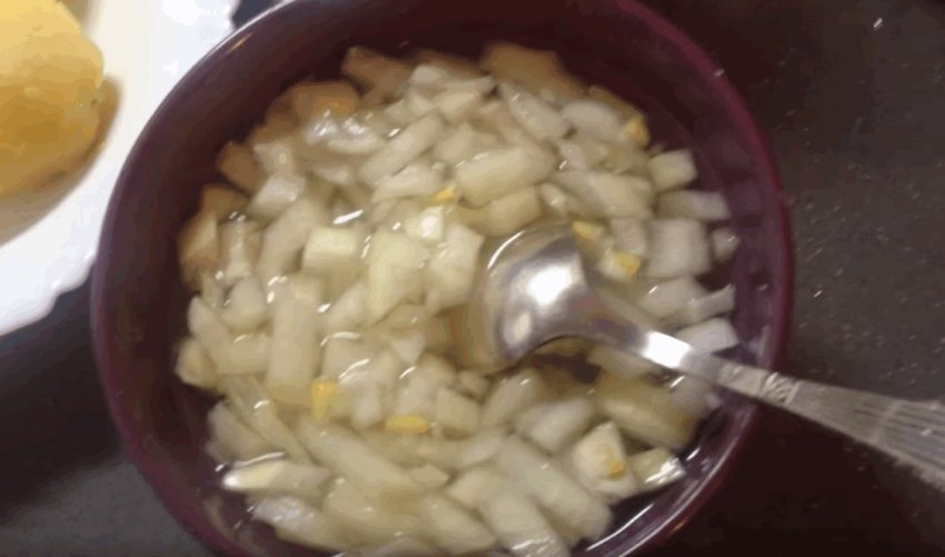 Замаринувати цибулю. Для цього дрібно покришити її, скласти в миску. Додати туди ж воду, яблучний оцет і цукор, перемішати. Залишити цибулю маринуватися в отриманій рідині на 15 хвилин.![]()