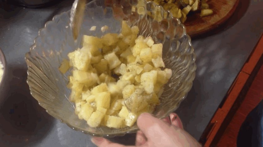 Картоплю нарізати кубиками середнього розміру, скласти в окрему миску. Додати по одній щіпці солі та перцю, влити столову ложку олії, перемішати.![]()