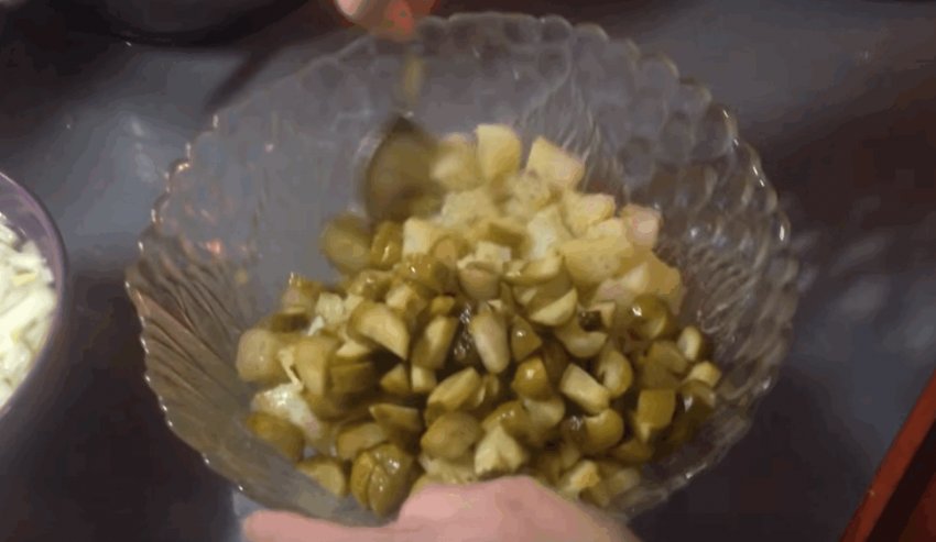 Малосольні огірки нарізати невеликими шматочками. Викласти їх у миску з картоплею, перемішати.![]()