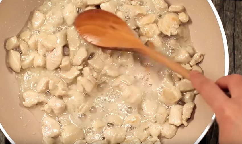 Обрізати курячу грудку від кісток, щоб вийшло філе, нарізати кубиками і підсмажити на соняшниковій олії до злегка золотистого кольору.![]()