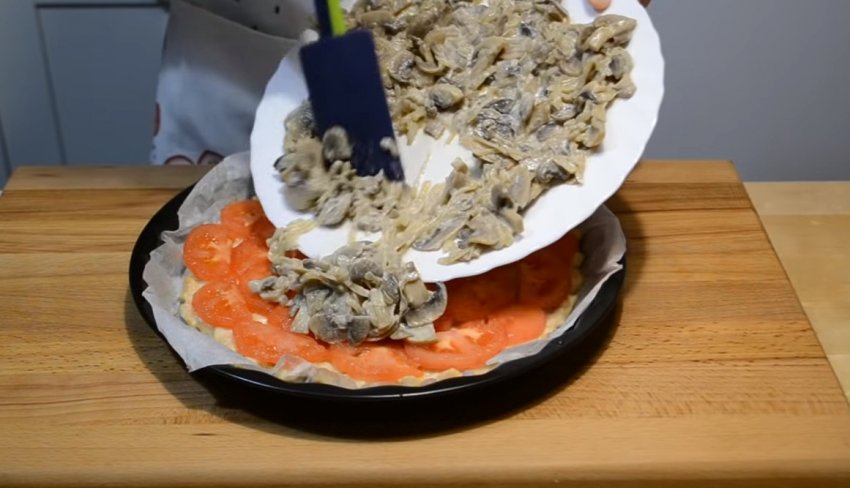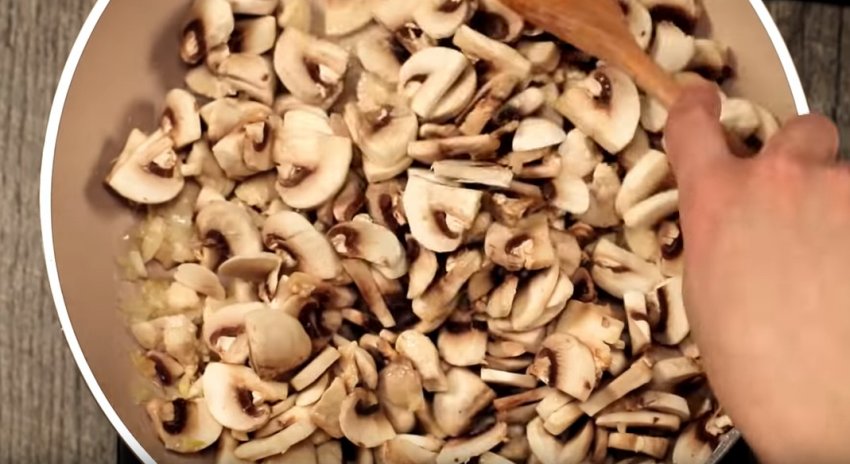Наступний шар зробити з печериць, підсмажених із цибулею.![]()