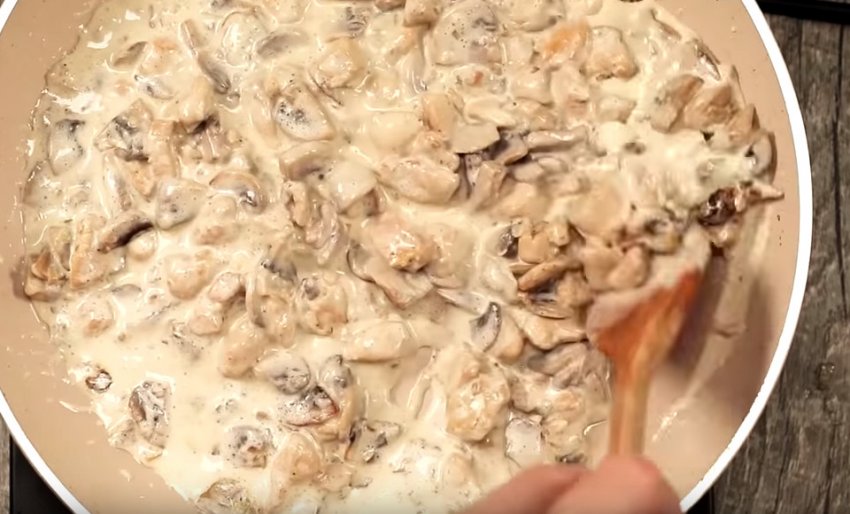 Залити все вершками, прокип'ятити, посолити, поперчити і зняти з вогню.Взяти форму для запікання, перекласти в неї курку з цибулею і грибами.![]()