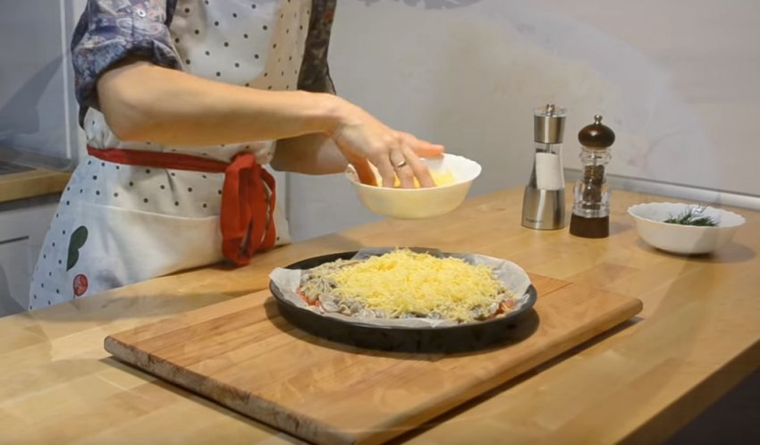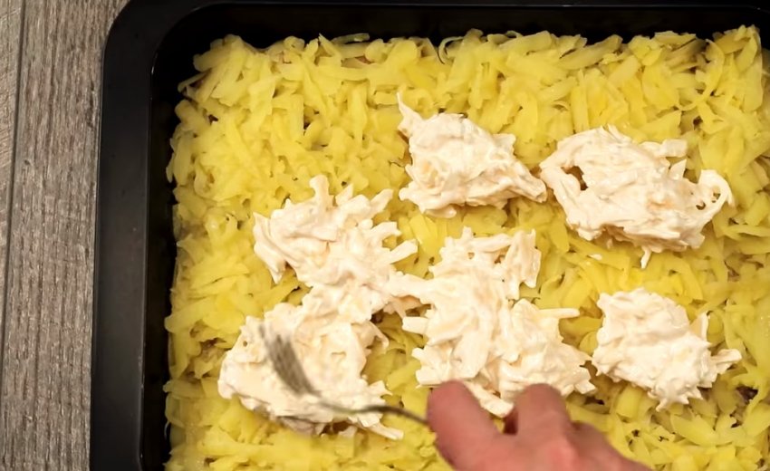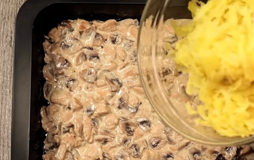Потерти картоплю на крупній тертці і розкласти її на печериці з куркою.![]()