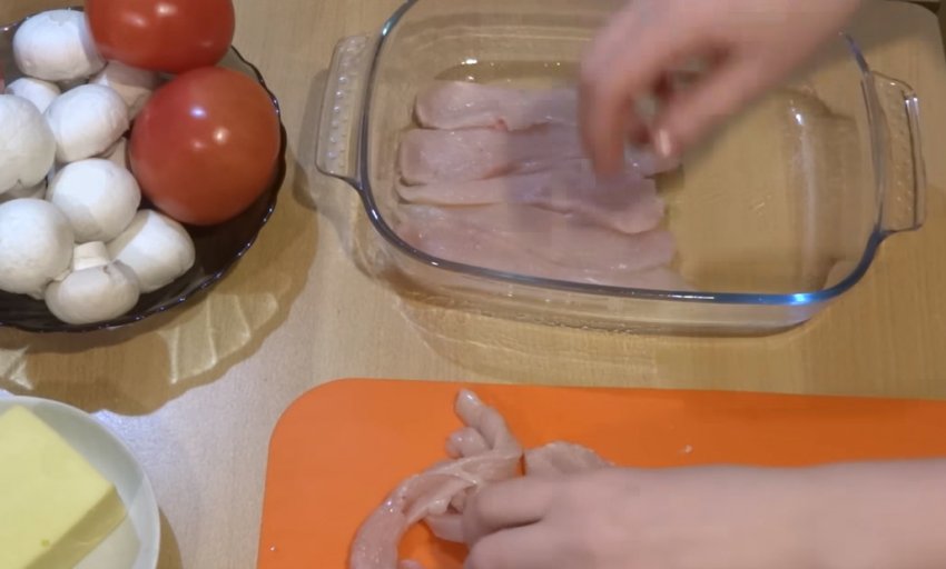 Відокремити шматочки філе від курячої грудки. Порізати їх на тонкі смужки, викласти у форму для запікання, змащену олією. Трошки посолити і поперчити.![]()