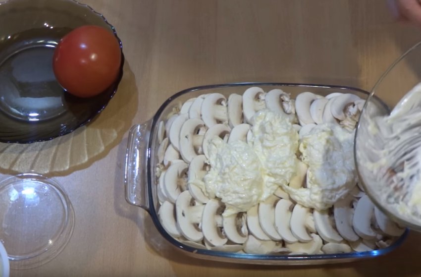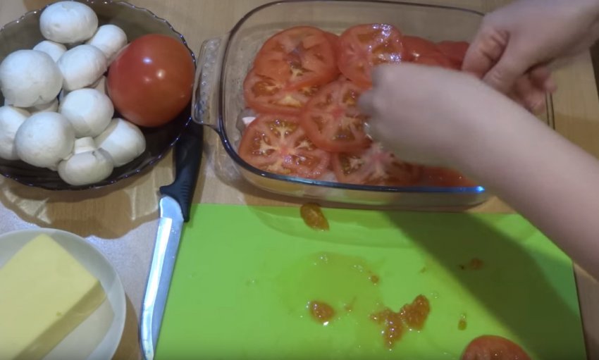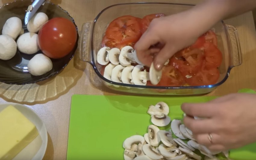Нарізати тонкими пластинками печериці та розкласти окремим шаром на помідори.![]()