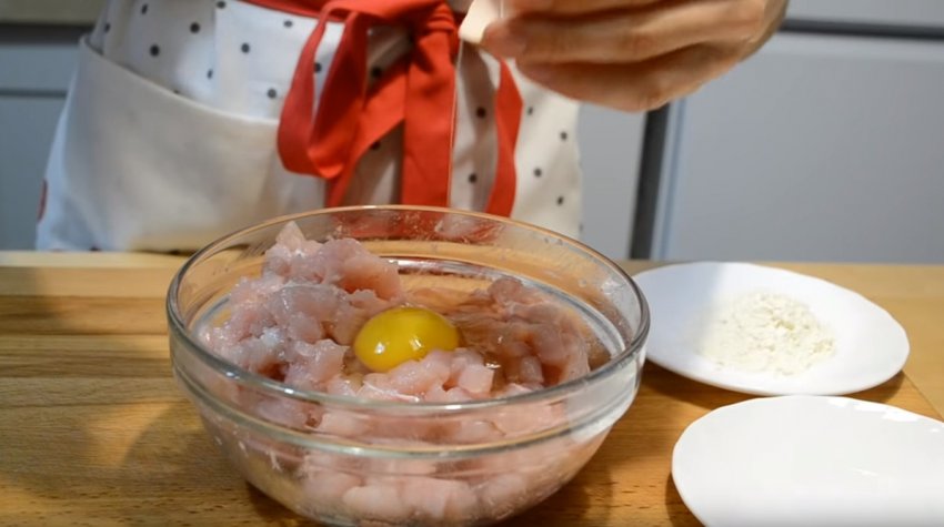 Узяти куряче філе і порізати його на дрібні кубики. Додати сіль і перець за смаком, а також одне яйце і столову ложку борошна.![]()