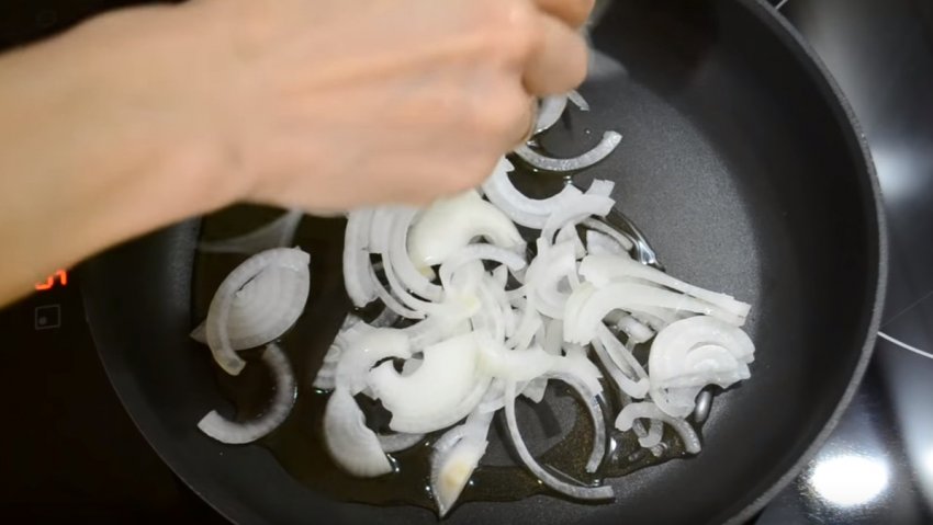 За цей час обсмажити на соняшниковій олії цибулю, нарізану півкільцями, до прозорості.![]()