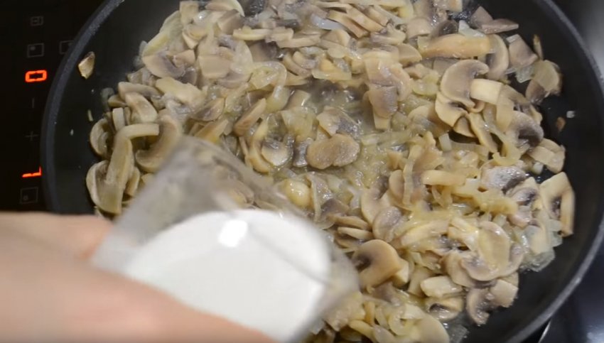 Подрібнити гриби на дрібні шматочки і кинути їх на сковорідку до цибулі. протушкувати протягом 10 хвилин на середньому вогні, додавши вершки, сіль і перець. перекласти в окрему миску, трохи остудити.![]()